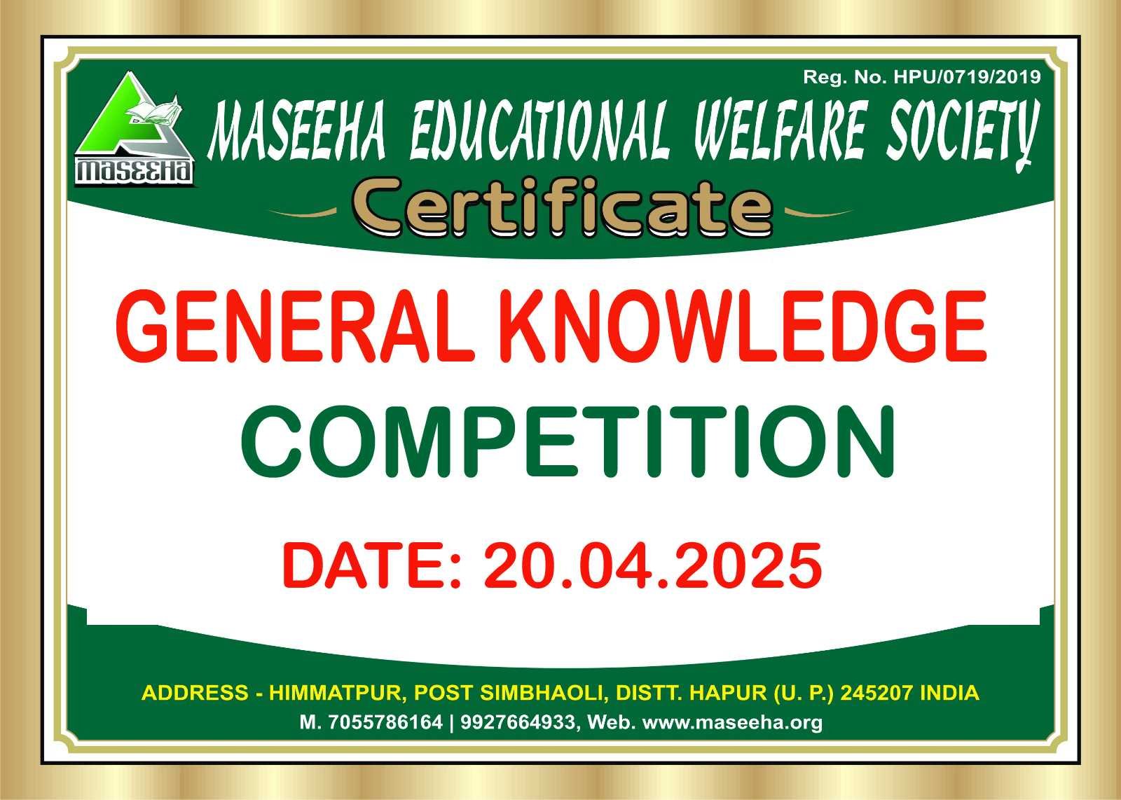 नोटिस दिनांक: 20 अप्रैल, 2025 विषय: सामान्य ज्ञान प्रतियोगिता का आयोजन प्रिय छात्रों और अभिभावकों, हमें यह सूचित करते हुए खुशी हो रही है कि हमारी संस्था के द्वारा बच्चों के सामान्य ज्ञान और जिज्ञासा को बढ़ाने के उद्देश्य से एक सामान्य ज्ञान प्रतियोगिता का आयोजन किया जा रहा है। यह प्रतियोगिता न केवल बच्चों को सीखने का मौका देगी, बल्कि उनके लिए एक मजेदार और रोचक अनुभव भी होगी। विवरण: दिनांक: रविवार, 20 अप्रैल, 2025 समय: सुबह 10:00 बजे से दोपहर 12:00 बजे तक स्थान: स्कूल सभागार छात्र विषय: प्रकृति, अंतरिक्ष, जानवर, और विज्ञान के रोचक तथ्यविशेष आकर्षण: प्रतिभागियों के लिए प्रमाण पत्र और विजेताओं के लिए आकर्षक पुरस्कार पंजीकरण: भाग लेने के इच्छुक छात्र अपने नाम कक्षा शिक्षक को 19 अप्रैल तक दें। । आइए, इस "सामान्य ज्ञान प्रतियोगिता" में शामिल होकर ज्ञान और मनोरंजन का आनंद लें। अधिक जानकारी के लिए (MANAVVAR SIR 7055786164) से संपर्क करें। नोट: कृपया समय पर उपस्थित हों और अपनी उत्साह भरी ऊर्जा साथ लाएँ | धन्यवाद,